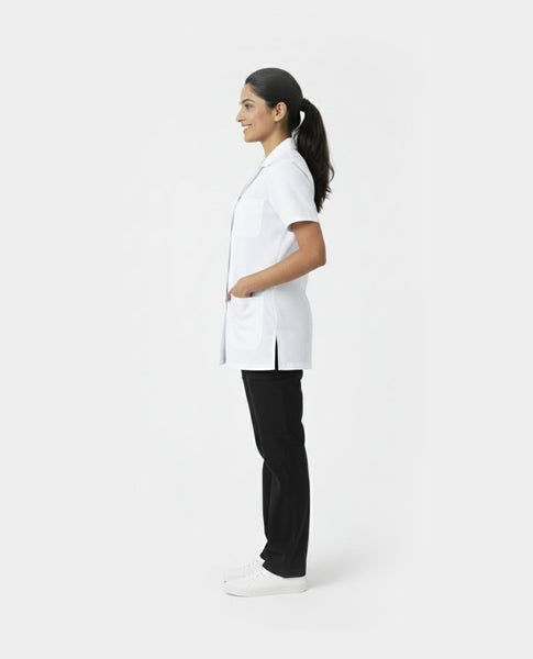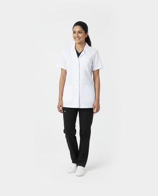 This Doctor's Coat features a practical design with one chest patch pocket and two large lower pockets, ideal for keeping your essentials within easy reach. Crafted from a durable polycotton blend, it combines the resilience of polyester with the comfort of cotton. The coat includes an open neck collar with front buttons and a center back slit to support unrestricted movement. This lab coat is engineered for functionality and professional wear in medical settings.